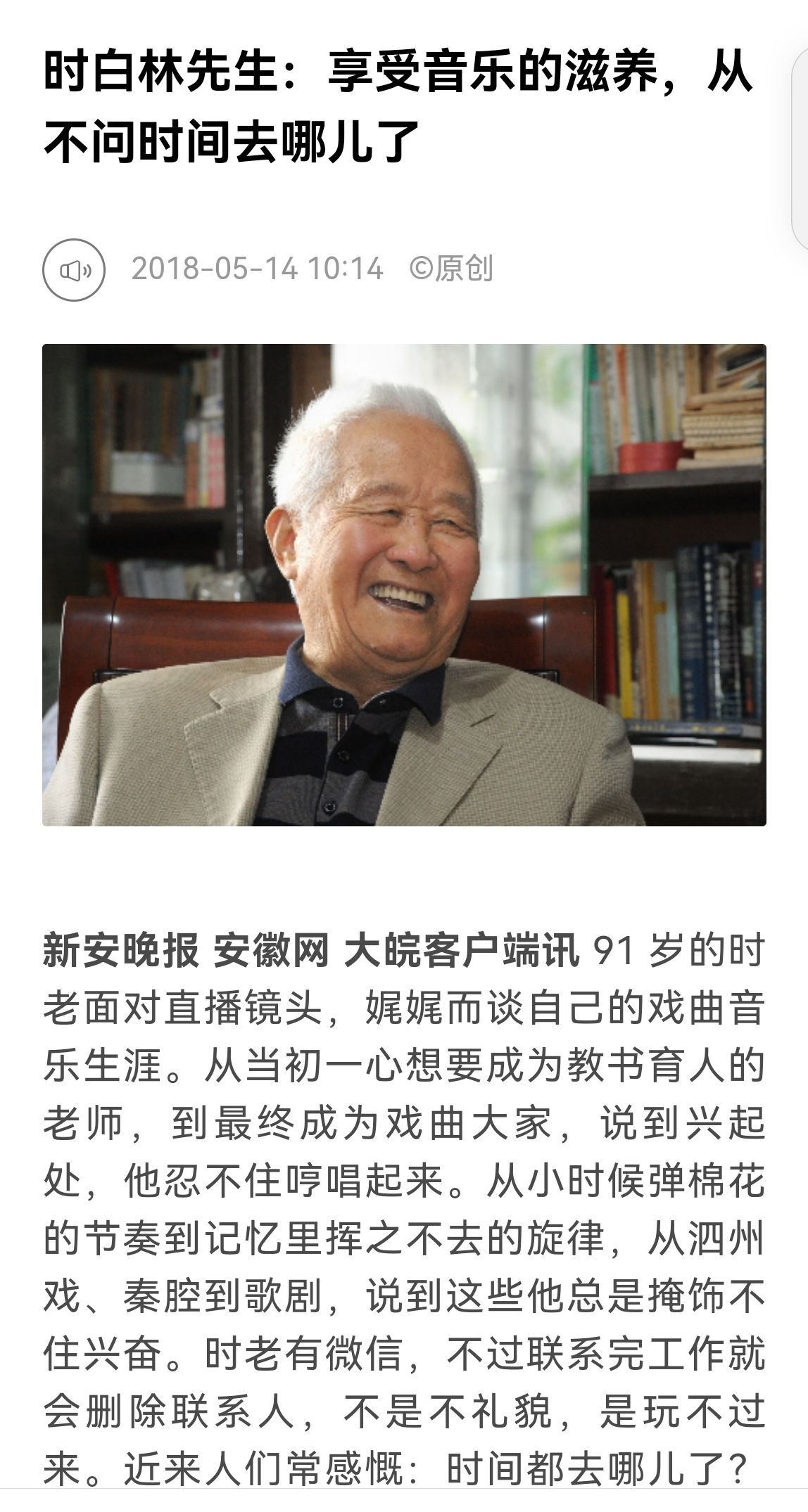 2018年5月,时白林先生应邀做客大皖新闻徽派栏目,采访中时老说,自己有微信,不过联系完工作就会删除联系人,不是不礼貌,是玩不过来,“近来人们常感慨,时间都去哪儿了?我从来不问这个,每天除了吃饭睡觉,时间都用在有用的地方。我一生只做了一件事,黄梅戏。”