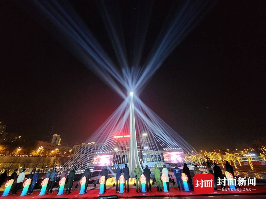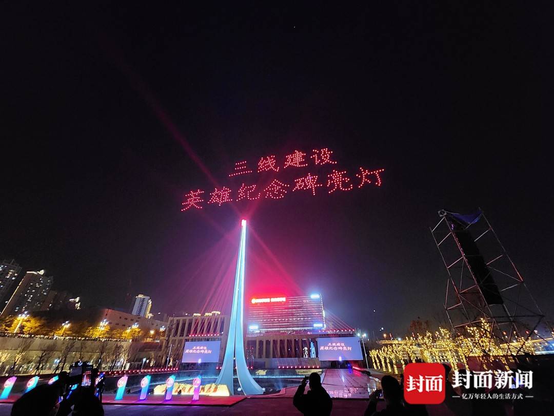 纪念碑点亮后,14束光束汇聚于碑顶,象征着当年14个省市区的三线建设者们,跨越山川、踏遍湖海,向大三线奔赴而来。随着纪念碑灯光由红色逐渐变为白色,寓意着建设者们的火红年华,映红了千锤百炼的岁月与理想,如今,奋斗精神从未远去,前辈英雄的足迹闪耀光芒。最后,所有光芒汇聚于碑顶,点亮了三线建设精神坐标,纪念碑如灯塔,指引前进方向。