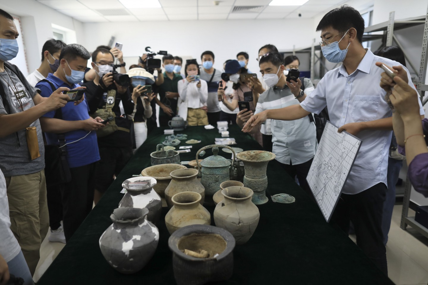 2022年7月20日,房山区琉璃河遗址,北京市考古研究院院长郭京宁(右一)在介绍考古发掘成果。新京报记者浦峰摄