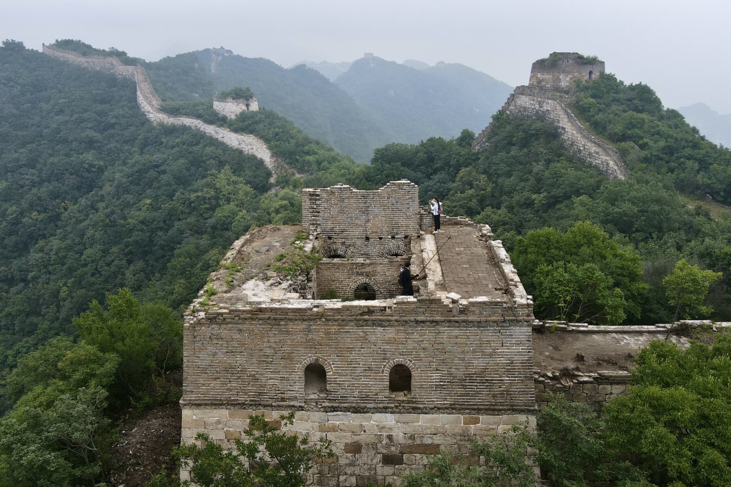 2022年8月17日,北京怀柔箭扣长城,141-145号敌台及边墙保护项目正在实施。新京报记者郑新洽摄