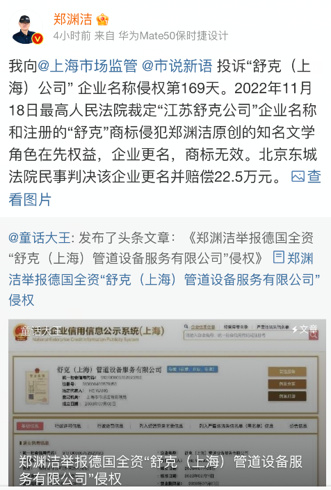 今年1月3日,是郑渊洁向国家知识产权局和上海市场监管局投诉“舒克(上海)管道设备服务有限公司”企业名称侵权第169天。