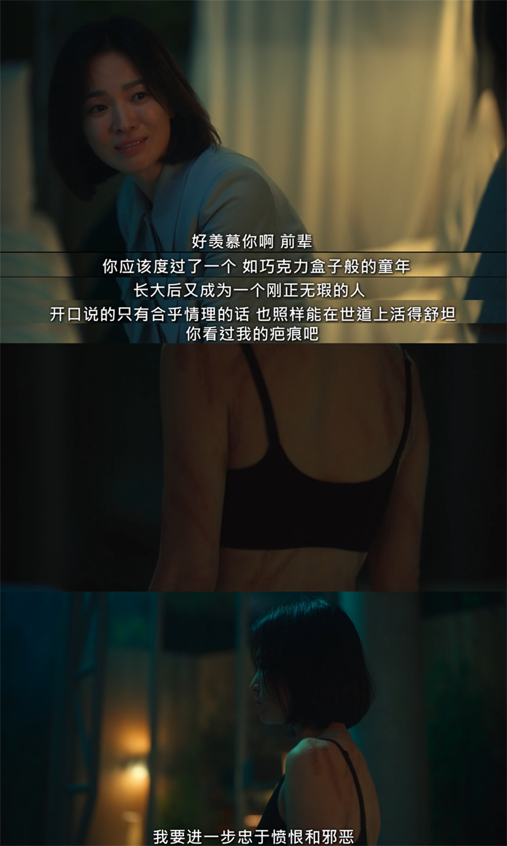 文东恩每每对朴妍珍独白,都是呢喃的倾诉口吻,就像是对亲昵的、思念的朋友,将自己的痛苦与憎恨娓娓道来,于无声处听惊雷,既体现这份仇恨的“日常”——它是受害者的日日夜夜,也在平静的反差中制造瘆人之感,还彰显出强烈的暴力美学的特征——用最美的台词诉说最深的仇恨,在美的羽翼下,让观众忽略仇恨可能滋生的恶与可怖,在情感上更容易站在女主角这边。