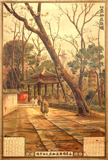 徐咏青为英商亚细亚火油洋烛公司绘1924年月份牌《深山古刹》