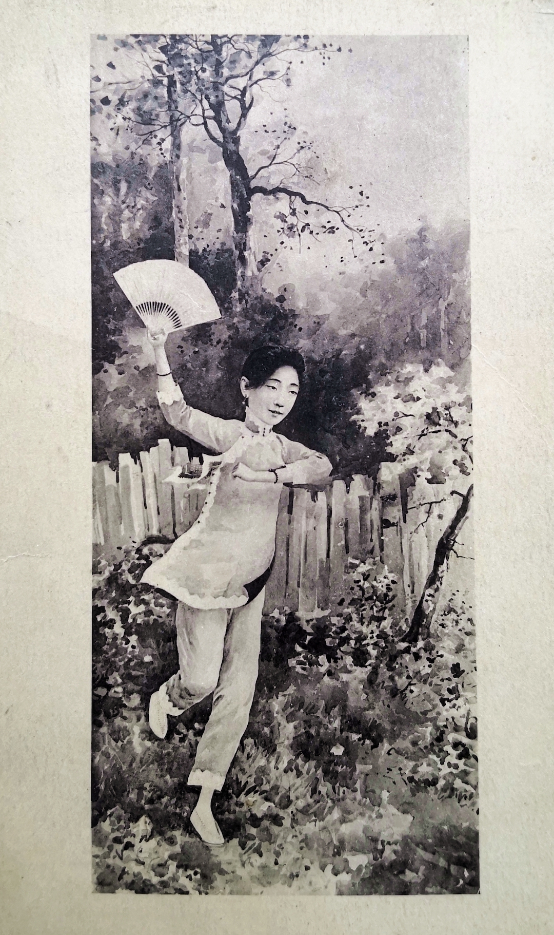 徐悲鸿1913年绘春夏秋冬月份牌四条屏之《扑蝶图》黑白版