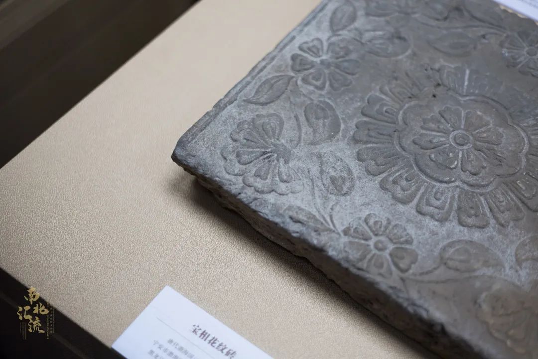 宝相花纹砖,唐代渤海国(698年—926年),宁安市渤海国上京龙泉府遗址出土,黑龙江省渤海上京遗址博物馆藏。宝相花是中国传统吉祥纹饰之一,盛行于隋唐时期。此方砖图案美观、秀丽,是渤海国典型的建筑材料之一,多用于宫殿台基两侧的垂带和踏道的铺设。