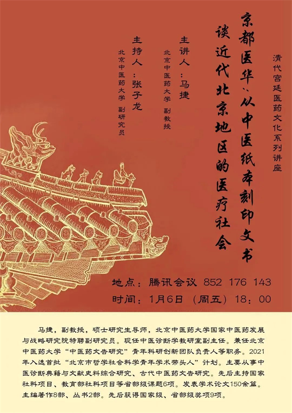 马捷老师现任北京中医药大学中医诊断学教研室副主任,主要从事中医诊断典籍与文献史料综合研究、古代中医药文告研究。本次讲座,我们请他从中医纸本刻印文书的角度,谈谈近代北京地区的医疗社会。