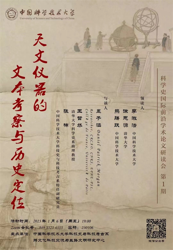 中国科学技术大学“科学史前沿学术论文研读会”第1期,邀请了李淑浩、徐思源、熊腾跃三位领读自己的论文,并与嘉宾进行对谈。本期主题为:天文仪器的文本考察与历史定位。