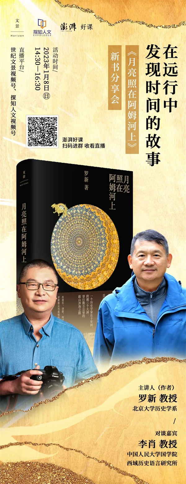 在新书《月亮照在阿姆河上》出版之际,世纪文景联合探知人文举办一场题为“在远行中,发现时间的故事”的新书分享会,并邀请和罗新两次同行中亚的人民大学国学院李肖教授作为对谈嘉宾,一起聊聊他们旅行中的见闻,听历史学者、考古学者是怎么在远行中讲述时间的故事,怎么在这一团混沌中找出秩序、意义和连续性。