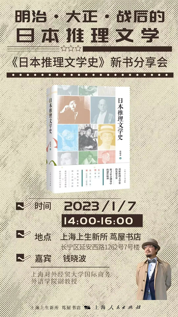 为什么日本推理文学如此繁荣?推理文学的发展如何受到时代影响、如何反映时代?1月7日下午,上海对外经贸大学钱晓波副教授将做客上海上生新所茑屋书店,为读者带来《日本推理文学史》的新书分享。钱晓波教授将从世界推理文学的发端,以及日本出现“侦探小说”概念开始讲起,分战前和战后两个部分细数日本推理文学小说的历史发展脉络和它的独特风格,从黑岩泪香、江户川乱步、横沟正史、梦野久作,到松本清张、岛田庄司、东野圭吾……