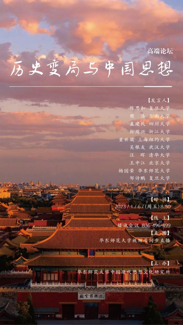 由华东师范大学中国现代思想文化研究所主办的本次高端论坛,邀请了多位学者专家线上分别做主题发言,包括《重申知识分子的岗位意识》《大同立教与儒学普遍主义》《历史变局与非常伦理》等等。