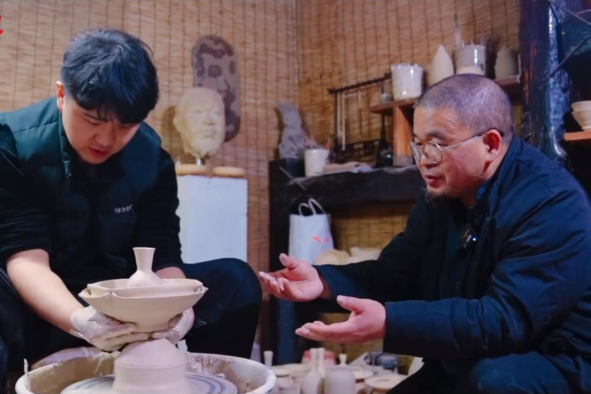 鹤壁窑古瓷烧制技艺省级非物质文化遗产项目代表性传承人张卫国正在第三进院子正房里指导儿子张艺驰拉坯。