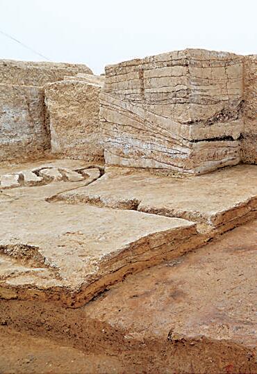 再看中央“宫城”区。有夯土围墙的长方形“宫城”东西宽约55米、南北长约67米,面积在3600平方米以上。“宫城”外有宽约15米、深10米多的“护城河”,它的两侧也有夯土护壁。加上“护城河”,整个“宫城”区占地面积就有8000多平方米。“宫城”中部偏北的主殿占地面积700多平方米,两个顶梁柱柱洞直径各约1.5米,中央火坛(火塘)直径3.2米——差不多是两个成年人的身长,规模之大前所未见。“宫城”东西两侧还各有一列侧室(侧殿)。所有这些宫墙、房墙都以版筑方法夯筑得十分坚实精整,窄处宽1~1.5米,最宽处可达5米,现存高度1.5~3.5米,是国内发现年代最早、规模最大、保存最好的夯土建筑遗存。