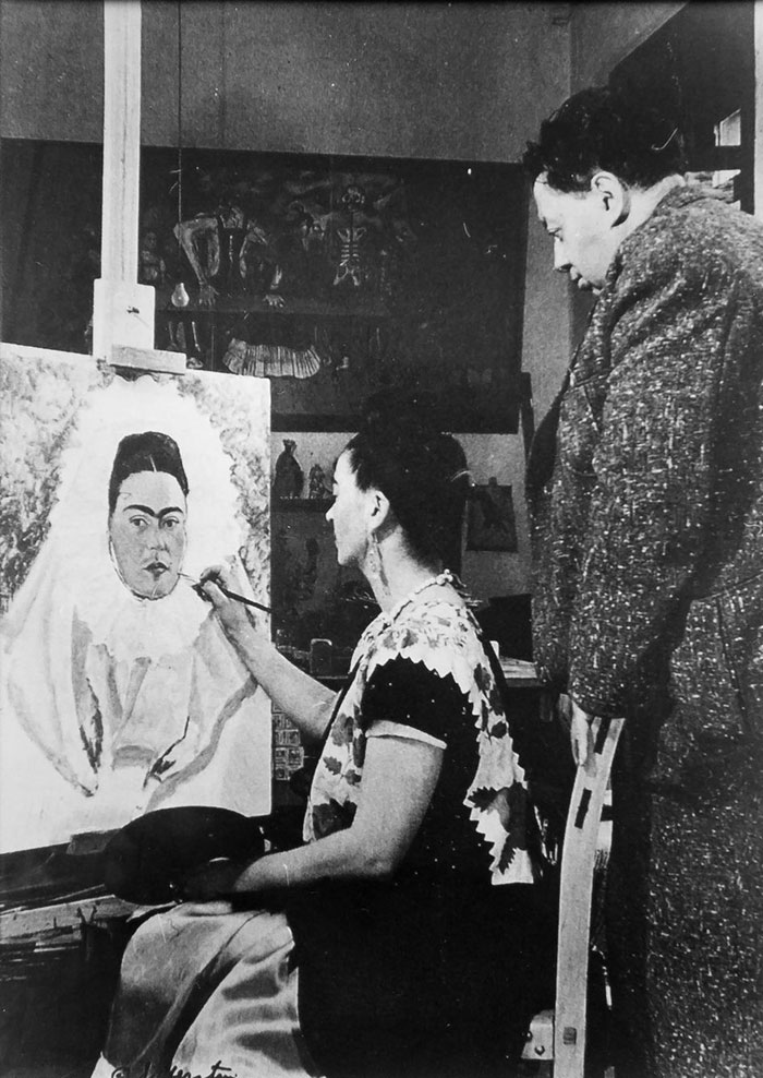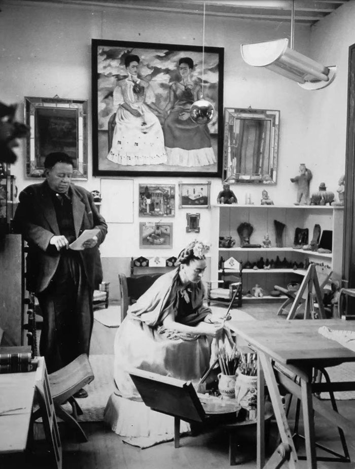 《无题》(弗里达与迭戈在蓝房子的工作室,身后是画作《两个弗里达》),摄影,佚名,1943年,墨西哥城科约阿坎区