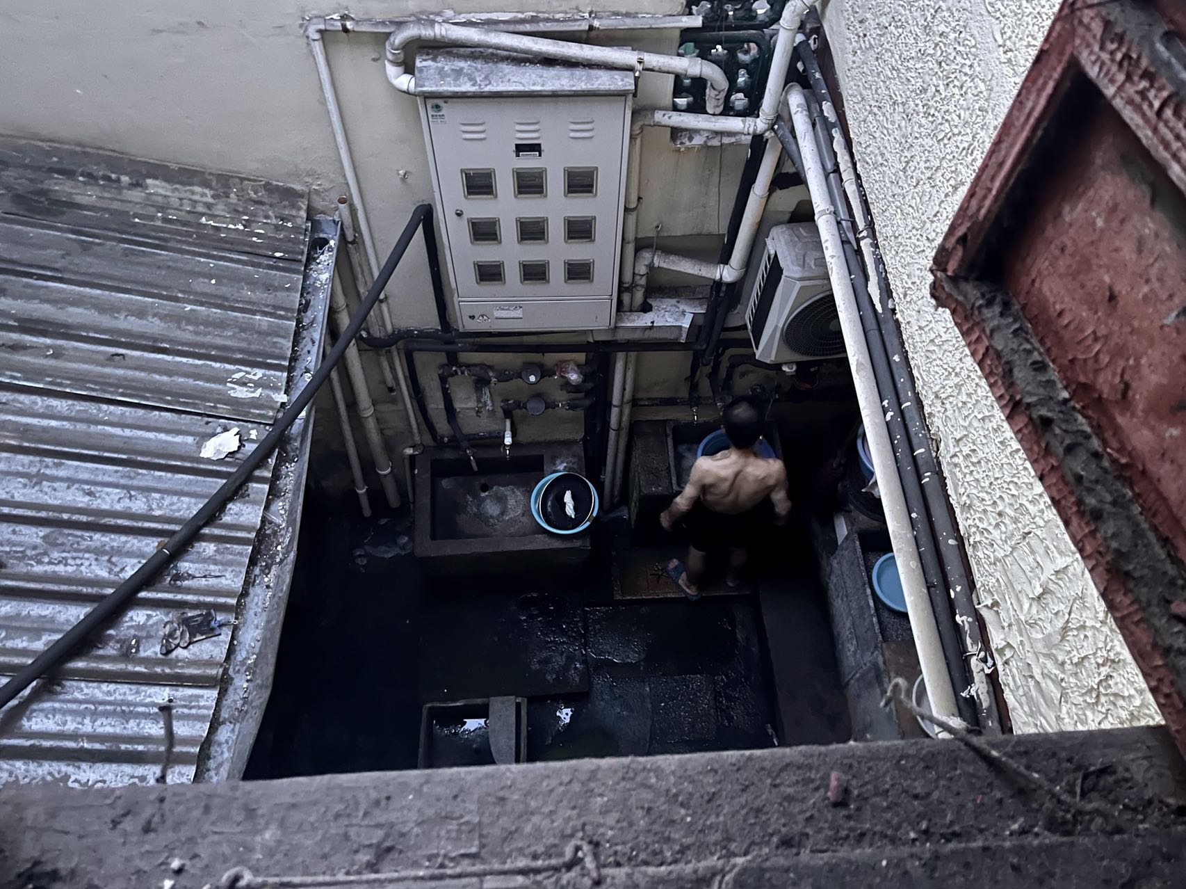 从许江家二楼看向天井。租户邻居正站在碑石上接水。澎湃新闻记者邹佳雯图