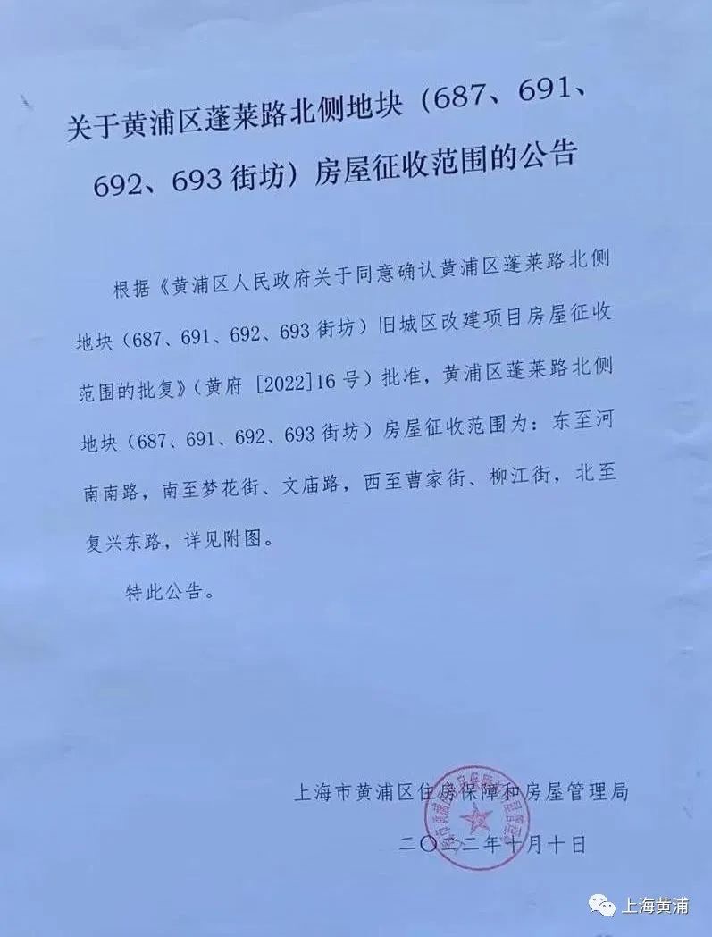 蓬莱北侧地块房屋征收公告。图片来源:微信公号“上海黄浦”