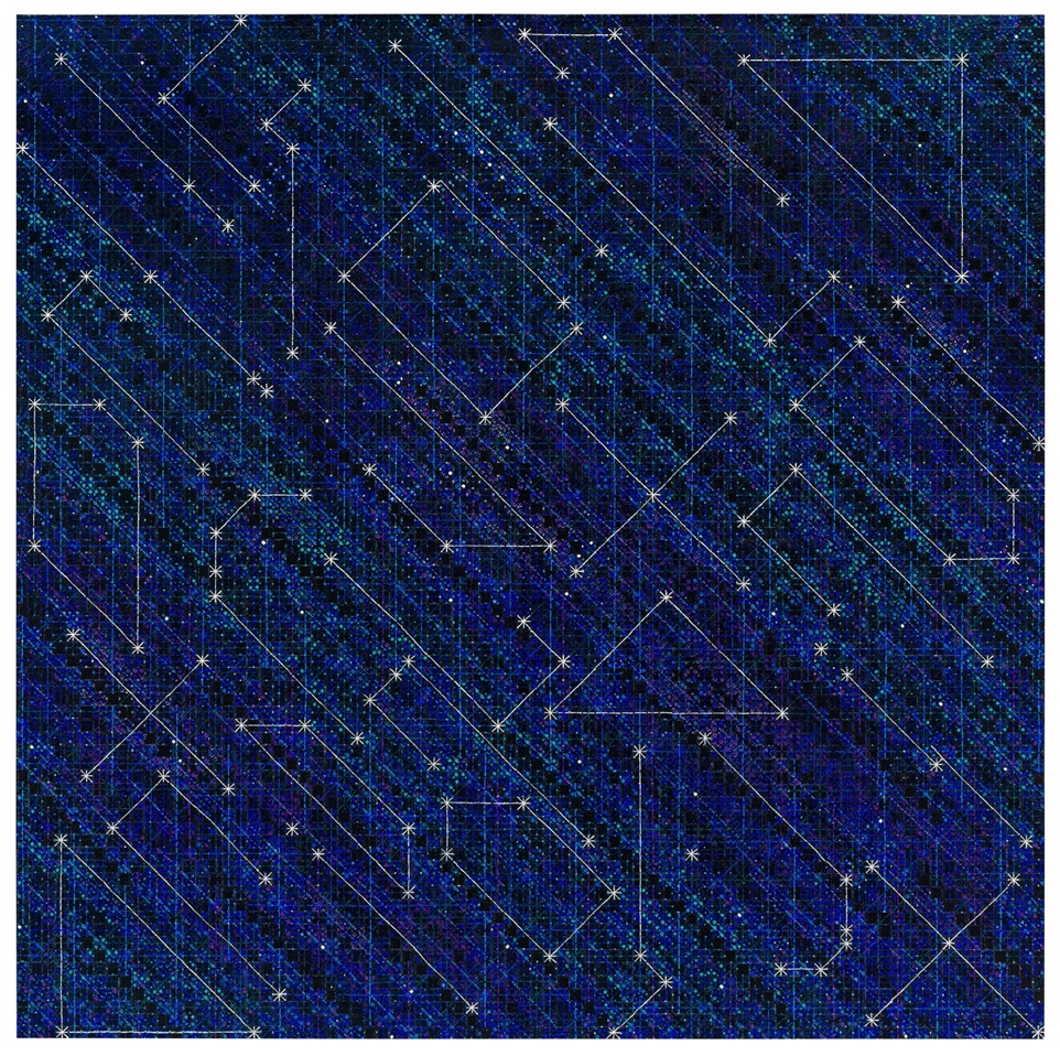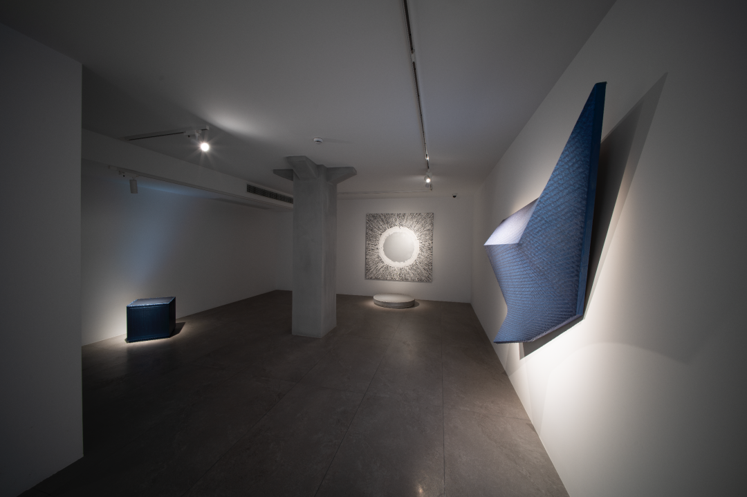 空间拥有五个展厅和一个多功能厅,展示面积约600平米。1号厅展出的是艺术家丁乙于2022年创作的两幅新作。“十”字的符号从上世纪80年代末开始贯穿了丁乙近40年的创作,但又有着不停的持续变化。这两张作品延续了丁乙从2015年开始使用的椴木板上丙烯木刻的手法,艺术家先在椴木板上绘制多层经过构思布局的颜色,再通过不同深浅、角度的雕刻将所需的颜色以理想的形状显露出来,于最上层绘制出的线条或形状形成最终的画面。画面整体视觉上既像海天相交的界线,又像空中高悬的星座,给观者带来一定的想象空间。