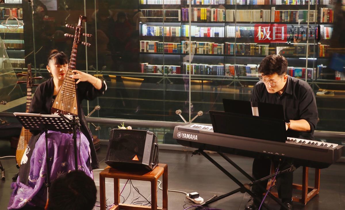小而美的舞台,打在书上暖调的灯光,浪漫的周末晚上,怎么不可以是相约在书店,听一场音乐会?1月13日晚,“‘新外文·正青春’外文书店与悦音室内乐新年音乐会”在外文书店四楼人文书苑举行。琵琶与钢琴二重奏奏响,为读者送去新年祝福。