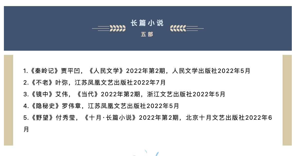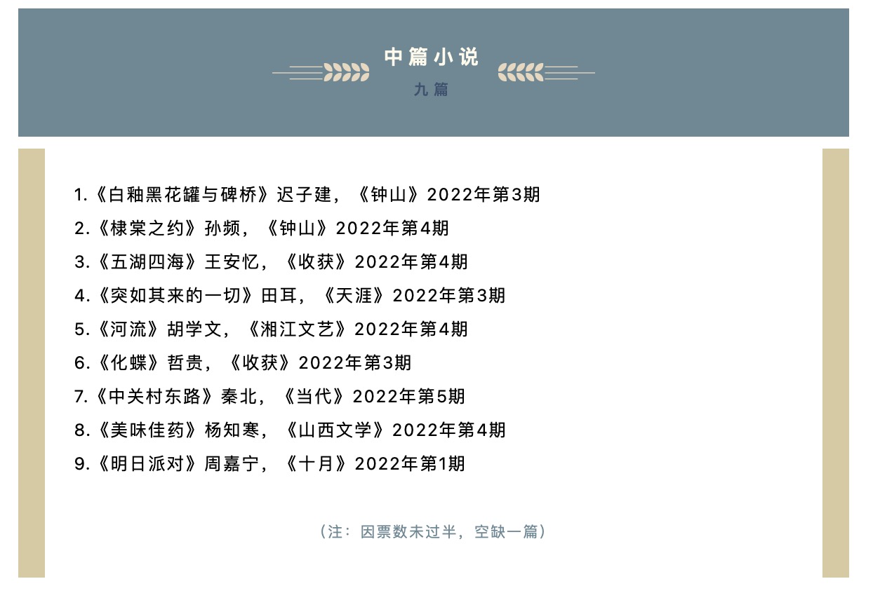 中篇小说里,迟子建的《白釉黑花罐与碑桥》、孙频的《棣棠之约》、王安忆的《五湖四海》、田耳的《突如其来的一切》、胡学文的《河流》等9篇作品上榜。上榜作品本应有10篇,因第10篇票数未过半,最终空缺一篇。