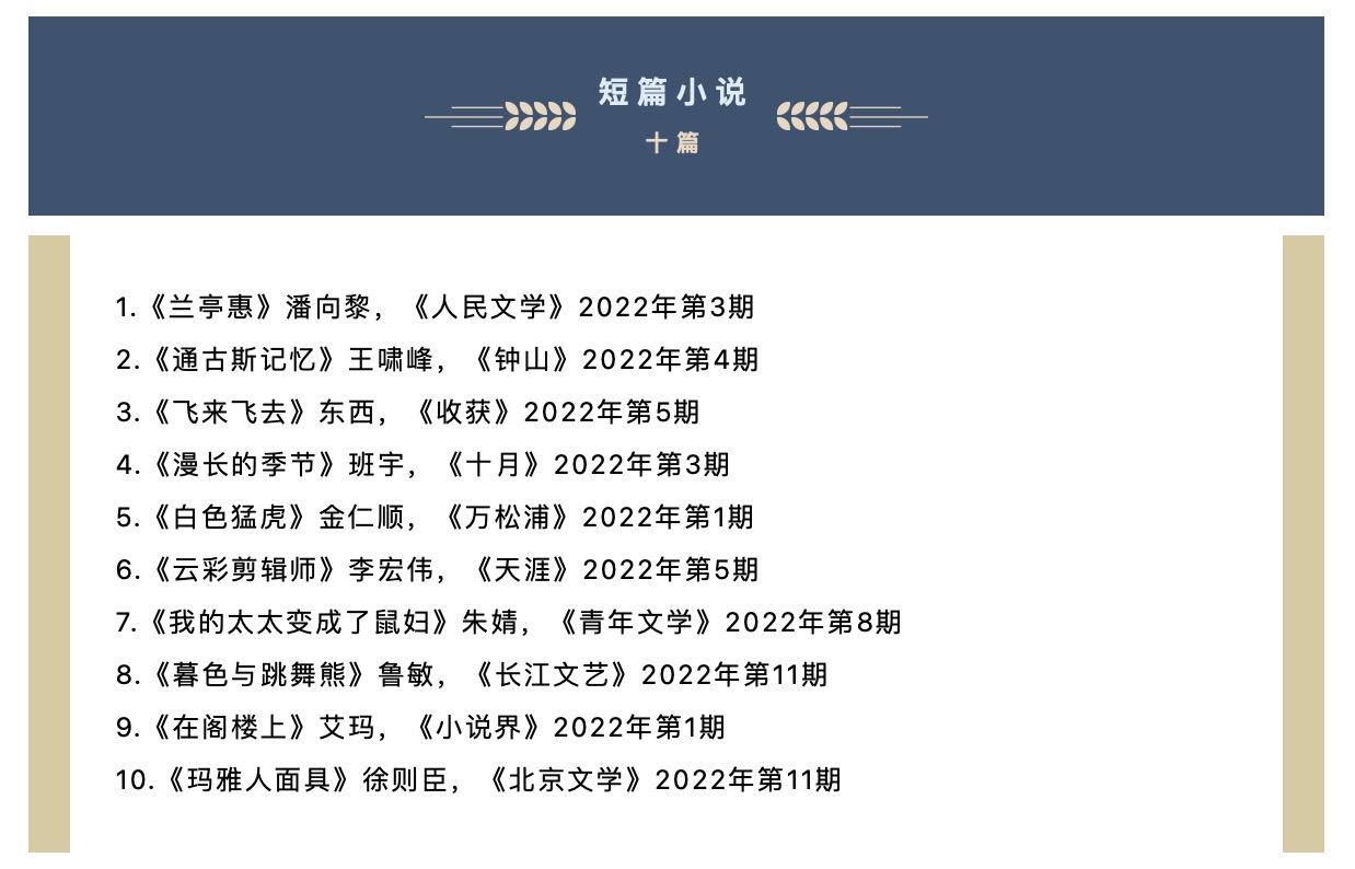 短篇小说里,潘向黎的《兰亭惠》、王啸峰的《通古斯记忆》、东西的《飞来飞去》、班宇的《漫长的季节》、金仁顺的《白色猛虎》等10篇作品在列。