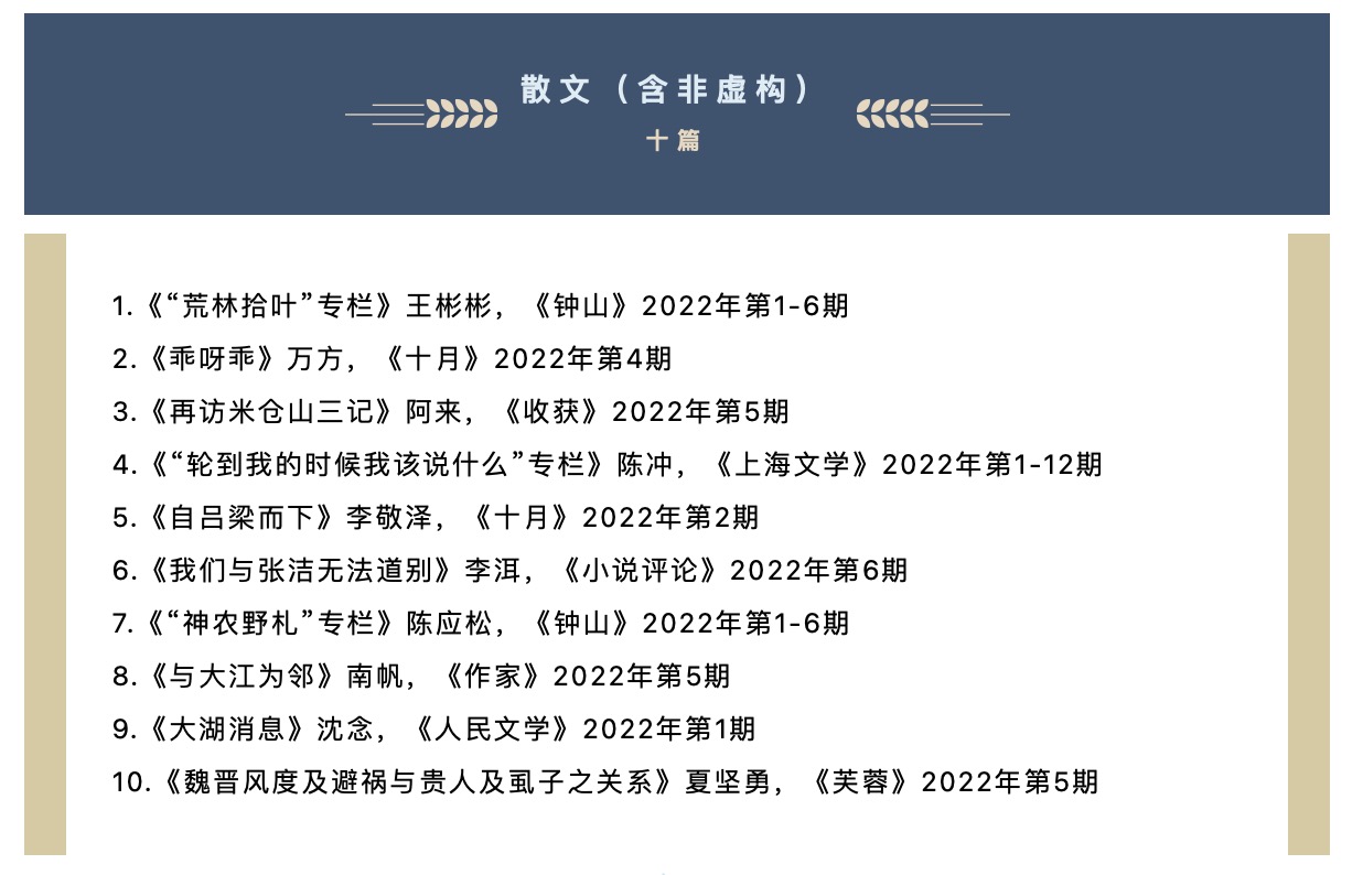 散文(含非虚构)领域,王彬彬的《“荒林拾叶”专栏》、万方的《乖呀乖》、阿来的《再访米仓山三记》、陈冲的《“轮到我的时候我该说什么”专栏》、李敬泽的《自吕梁而下》等10篇作品上榜。