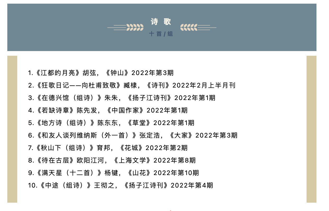 诗歌中,胡弦的《江都的月亮》、臧棣的《狂歌日记——向杜甫致敬》、朱朱的《在德兴馆(组诗)》、陈先发的《若缺诗章》、陈东东的《地方诗(组诗)》等10首/组诗歌上榜。