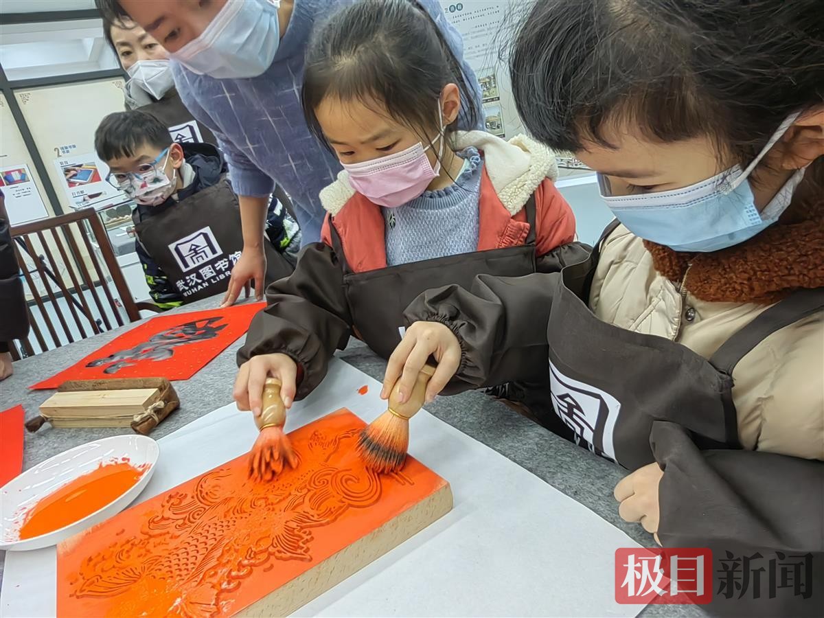 1月15日上午,武汉图书馆5楼古籍修复中心,一场“非遗拜年 雕版送福”读者体验活动,吸引了小读者和家长踊跃参与。有人用雕版印刷出了“康熙福”,有人用雕版印刷出了“孔子像”,还有人用雕版印刷出了“年年有余”……红色的宣纸、热情的祝福,映红了小朋友的笑脸。
