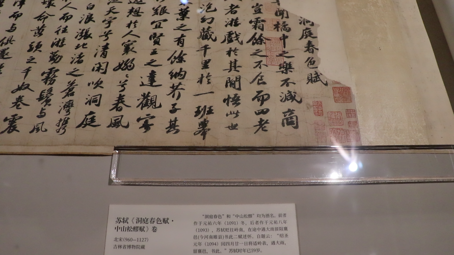 吉林省博物院藏《洞庭春色赋?中山松醪赋卷》。《洞庭春色赋》作于元祐六年(1091),当时苏轼在颍州任上,安定郡王赵世淮以黄柑酿酒,取名“洞庭春色”。他的儿子赵德麟,当时任颍州签判,与苏轼关系友善,以洞庭春色酒赠送苏轼,苏轼乘兴作《洞庭春色赋》。元祐八年(1093),哲宗亲政,苏轼外任定州,他在定州以松醪酿酒。定州是古中山国,故苏轼将酒取名中山松醪,并因此作赋。