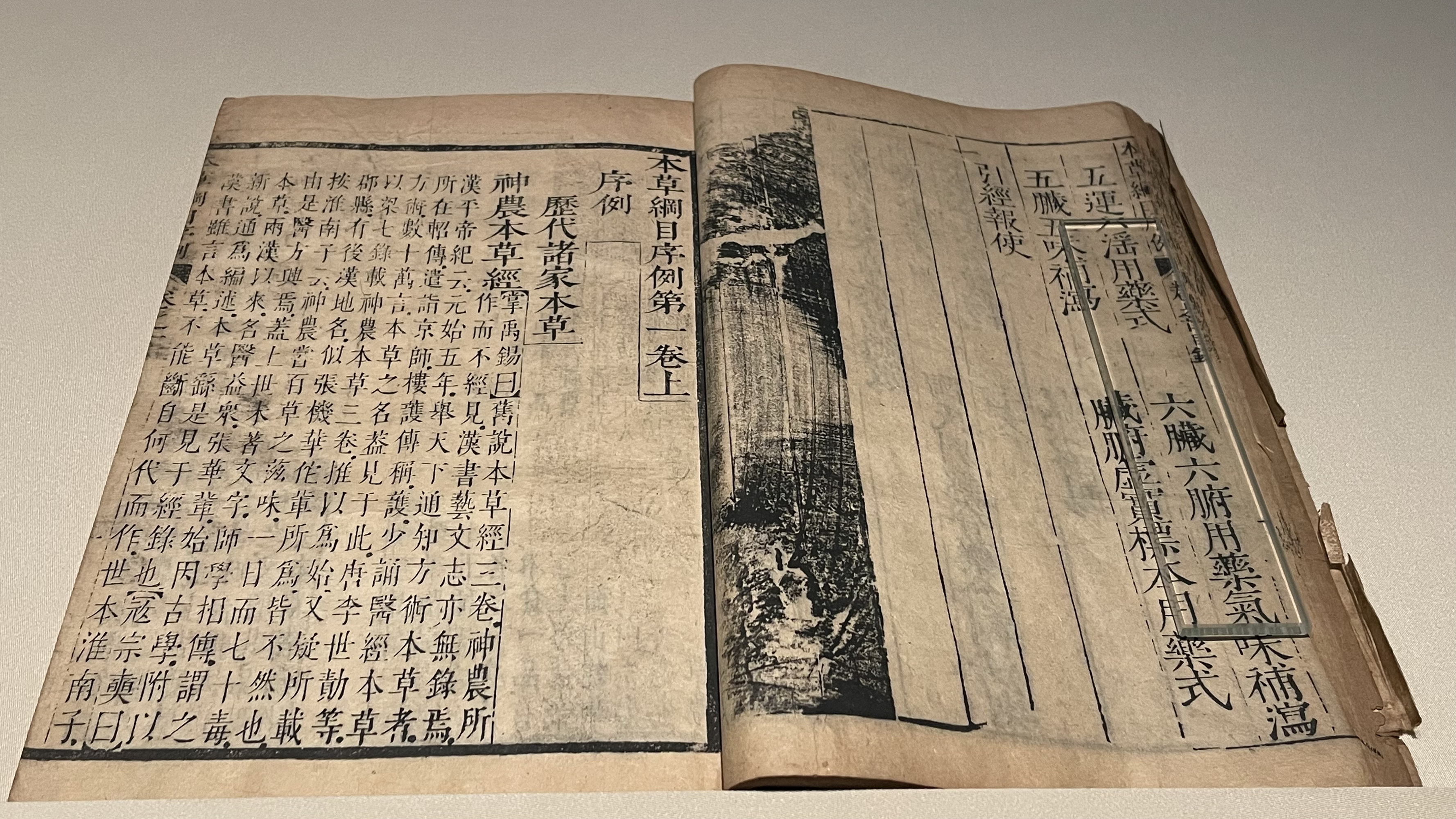 又比如《本草纲目》是李时珍参阅八百余种古代文献,历时二十七年编成的医药学典籍,系统总结了中国16世纪以前的药物学知识与经验。该书版本以明万历年间胡承龙金陵刻本为最早,又有江西本、杭州本、合肥本三系统,被称为“一祖三宗”。上图图书馆此次展出的明万历三十一年(1603)张鼎思江西刻本为江西本系统中的最早版本,亦为首部官刻本。