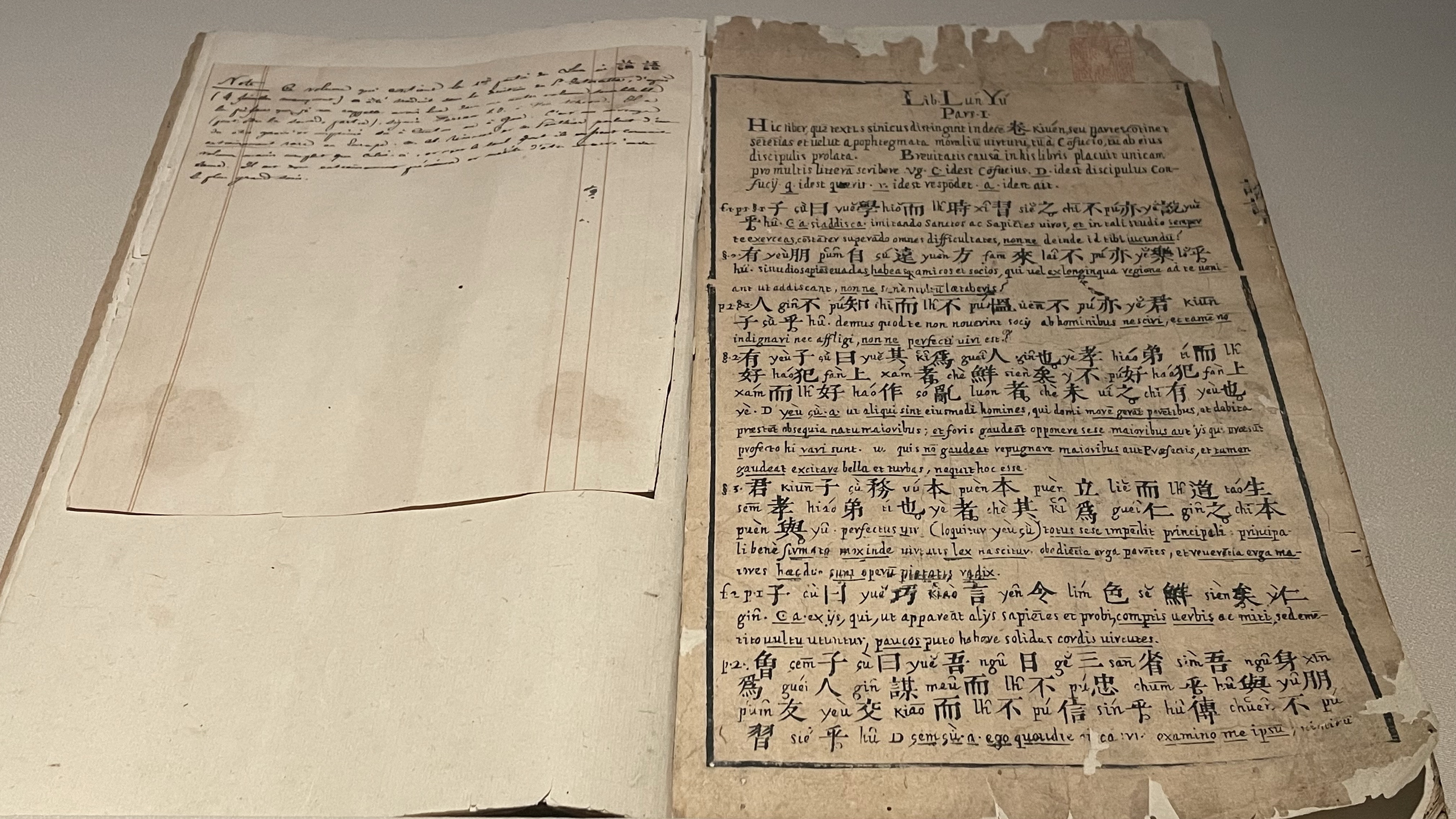 走进展厅,那些穿越时空的历史微粒伴随着《尚书》《史记》《论语》《天工开物》《本草纲本》《楚辞》《徐霞客游记》《道德经》等十一部典籍徐徐展开。上海图书馆从珍贵馆藏中精选有代表性的典籍展出。如1662年《论语》拉丁文译本,是上海图书馆徐家汇藏书楼最为珍贵的善本藏书之一——残本《中国智慧》,这本书是意大利耶稣会士殷铎泽与葡萄牙耶稣会士郭纳爵合作,将部分《论语》和《大学》翻译成拉丁文,取名《中国智慧》,开中国典籍西译之先河。此部拉丁文《论语》翻译的是《论语》前十篇《上论》的内容,为海内孤本,珍稀程度可见一斑。