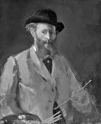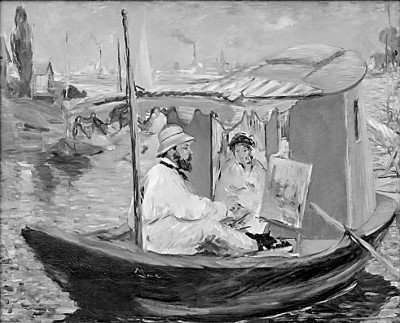 在马奈画的一幅莫奈肖像中,这位年轻的艺术家正在阿让特伊的画室船上创作一幅划船题材作品。马奈这幅画的核心命题是对印象派画家户外绘画行为的再现。画面上,莫奈的右手是用不超过三笔的笔触给定义出来的。他正在作画,身子后仰,左手拿着调色板,至少三把长刷子被放在膝盖上。他似乎抓住了另一支画笔,似乎还在用大拇指和前两个手指作画。他的这种随性有力的握笔和描绘方式,简直是印象派画家直接绘画时的典型形象。同时,马奈的线条也透露着姿势的表现力。