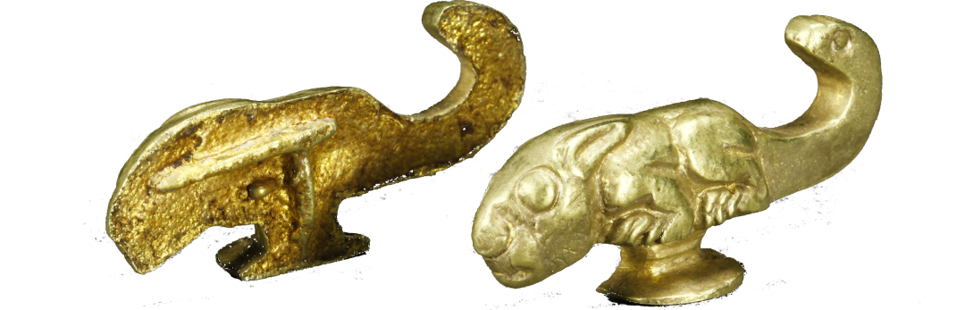西汉大云山江都王陵M9出土的符式兔形金带钩,也是南京博物院藏文物,兔尾向后呈钩,腹下饰一圆钮。整器左右可以分开,中间以暗卯相合,设计精巧,生动形象。
