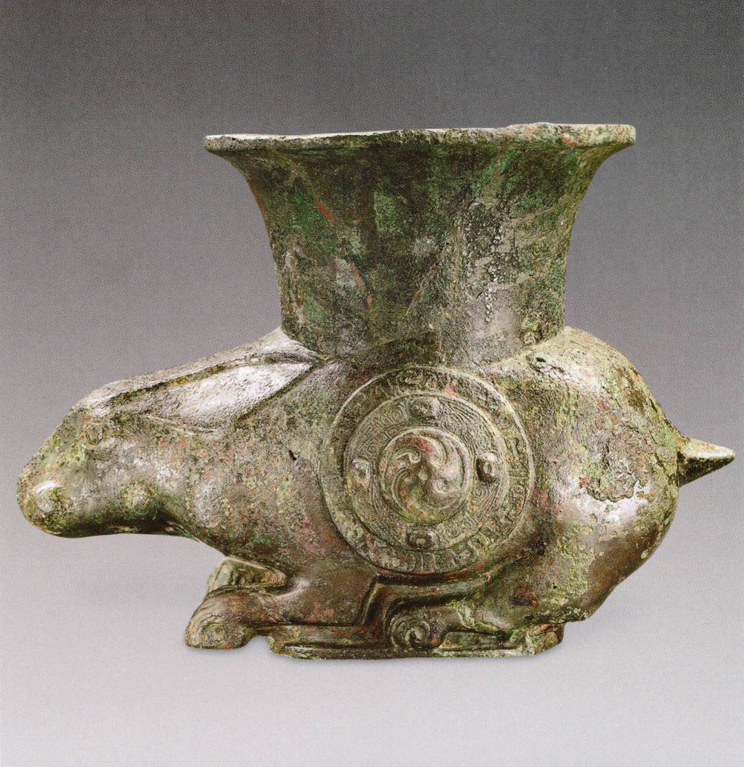 在山西曲村晋侯墓地8号墓出土的青铜兔尊,则是目前为止最早的、以兔作为尊的器形的青铜器。这一只少见的青铜兔兔头微伸,双目圆睁,两耳紧贴脊背,四肢弯曲,呈跃跃欲试状,尾巴短小,背上驮一尊口,兔身两侧饰圆形的火纹和雷纹。