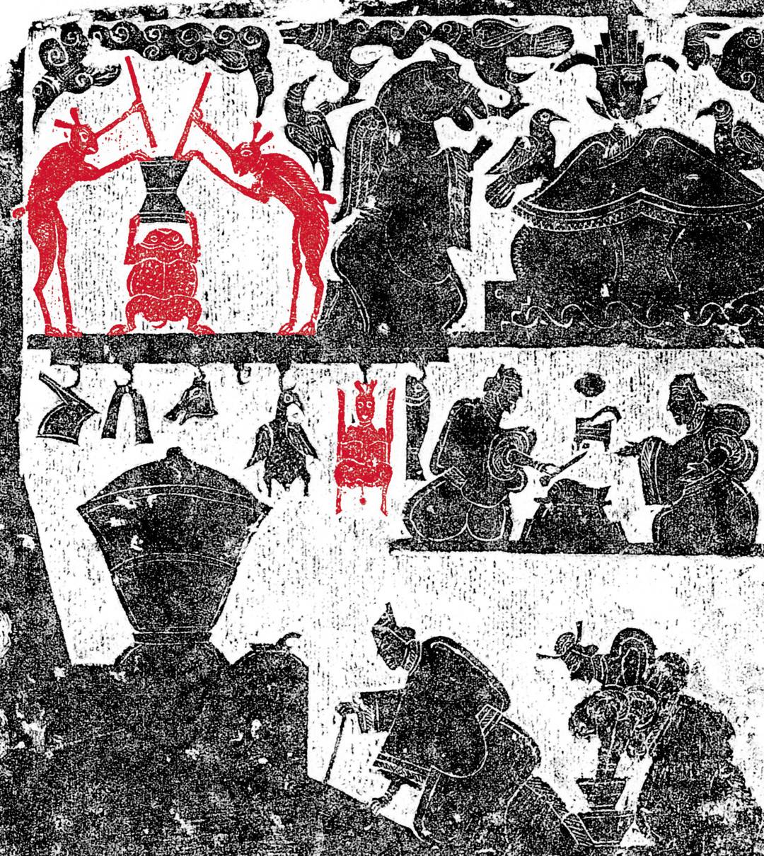而在山东嘉祥宋山4号祠堂东壁的东汉画像石中的兔子,则可以代表世俗和神话中两种不同的“兔”形象。“在画像的上侧,东王公居中,马头、鸡头、狗头带翼神人跪于左右两侧,在画像石左侧有面对面站立的两兔分别用一条前肢扶臼,一条前肢握杵,似在捣药。两兔中间有一蹲着的蛤蟆,用前肢举臼。在画像的下侧,厨房的房梁上悬挂着鱼、鸡、猪头、猪和兔等,这些都是准备烹饪的肉食。”