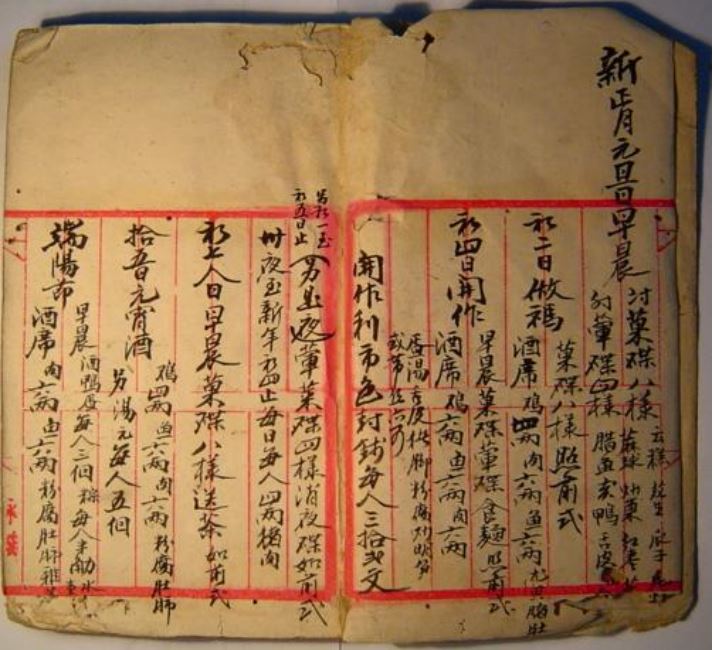 就目前所见,墨庄与典当铺的相关商业书中,都有对春节期间饮食标准的详细记录。相比之下,墨作是辛苦劳累的行当,而典业中人之待遇则相对较好。另外,抄本《榨中食则》,是清代有关榨油业的商业书,其中也有《年节清规》一目,内容则包括“初四盘账酒”“初七定事酒”和“十五元宵酒”等。所谓定事酒,是指当日老板宴请店内伙计饮酒,并决定伙计之去留。吃“定事酒”的日子,有的店铺是在正月初五,因此日为财神日,店铺新年重新开张,故称“财神定事酒”(又叫“利市酒”),有的则放在正月初七人日这一天。吃定事酒时,被老板推到首席就座的伙计,即表明此人当年将被辞退,过后必须尽快离店。因此,伙计们在吃定事酒饭之前无不忐忑不安……因为倘若被辞退,便要赶紧找到从业的下家,否则就只能做“茴香萝卜干”——卷起铺盖打道回府了,而这在作为商贾之乡的徽州,显然是脸面尽失的一件事。
