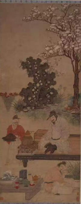 明代丁云鹏《煮茶图》描绘的是唐代陆羽煮茶的典故。背景以太湖石点缀,盛开的玉兰树下,陆羽斜倚于紫檀嵌螺钿榻上,目光正专注于面前的竹茶炉。旁有一赤足奴仆正手捧点心盘,另一仆正蹲于地上备水。在榻前的石案上,则放着漆嵌镙钿食盒、白釉茶叶罐、紫砂茶壶、白釉茶盏等茶器,全作极具文人之气,风雅至极。