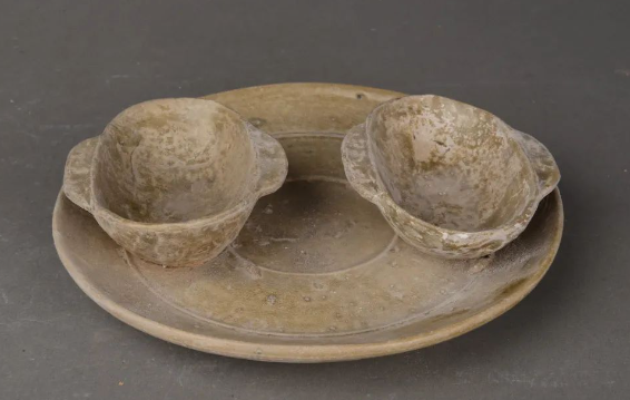 耳杯,又名羽觞,出现于春秋战国时期,一直延续使用至魏晋。吴文化博物馆藏有张陵山西晋墓出土的青瓷耳杯及承盘。