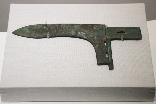 戈是一种古代兵器,横刃,用青铜或铁制成,装有长柄。这件戈上铸有铭文:楚王邵之行。