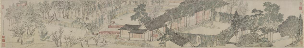 此卷是明代画家钱穀应友人张凤翼的邀请,描绘其家园中春夏之间的景色,卷首有文徵明题“文鱼馆”三字,卷后有王世贞行书《求志园记》。画家从右侧园门画起,以怡旷轩、风木堂、尚友斋为中心,前有庭,后有园,渐次展开。王世贞所撰《求志园记》中采芳径、文鱼馆、香雪廊皆按图可索。这座“旦而旭、夕而月、风于春、雪于冬”的甲第名园,当年文人云集、清谈雅会的盛景似乎随着手卷展开历历在目。