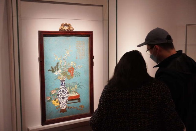 1月25日,香港故宫文化博物馆内,两位参观者正在观看清乾隆年间掐丝珐琅“岁朝图”挂屏的相关介绍信息。“岁朝图”,顾名思义,是为了庆贺正月初一而创作的图,画中内容一般为花卉果实等静物搭配贺岁诗词,呈现出“事事如意”“花开平安”“金玉满堂”等不同的吉祥寓意和新春祝福。