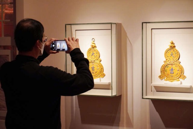 1月25日,香港故宫文化博物馆,一位参观者正在拍摄清乾隆年间掐丝珐琅“大吉葫芦”挂屏。葫芦,有长寿、多子多福的寓意。