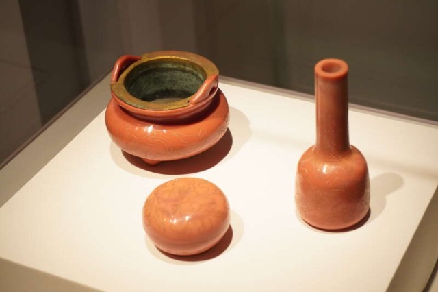 1月25日,香港故宫文化博物馆,清乾隆年间玻璃戗金“缠枝花纹三式”正在展出。“三式”包括炉、瓶、盒三件器物。