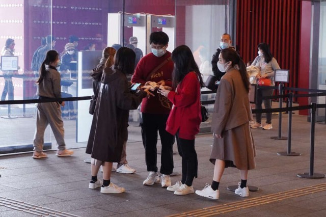 1月25日,香港故宫文化博物馆迎来新一天首批参观者。两位身着“中国红”配色衣服的参观者正在检票进馆。