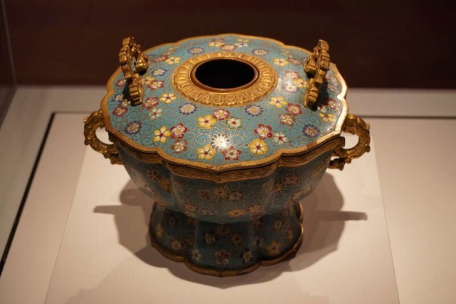 1月25日,香港故宫文化博物馆,清乾隆年间掐丝珐琅“花卉纹火锅”正在展出。新春期间,天寒地冻,火锅成为人们钟爱的时令佳肴。据史料记载,以乾隆为代表的清代皇帝多爱食火锅。