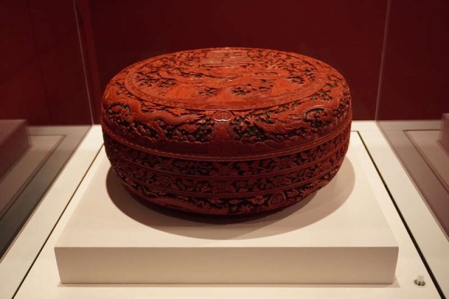 1月25日,香港故宫文化博物馆,清乾隆年间剔红漆器“飞龙纹宴盒”正在展出。此盒专为皇帝准备,摆在宴桌上,用来盛放饺子。