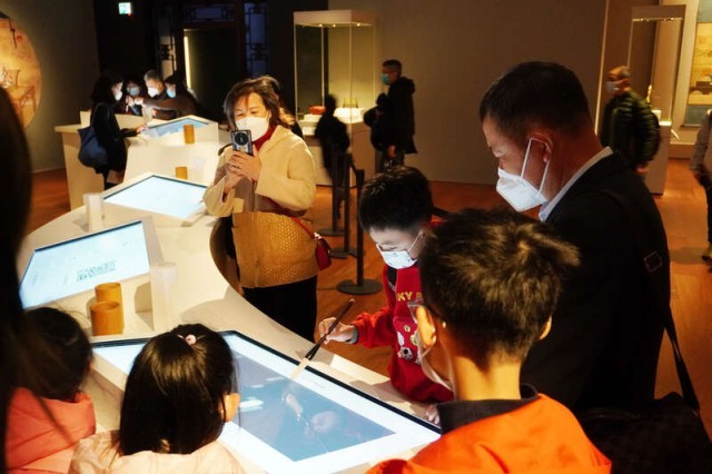 1月25日,香港故宫文化博物馆,一位香港小朋友正在多媒体设备上体验毛笔字书写。正值新春假期,很多家长带领小朋友走进博物馆,感受中华优秀传统文化的底蕴和魅力。