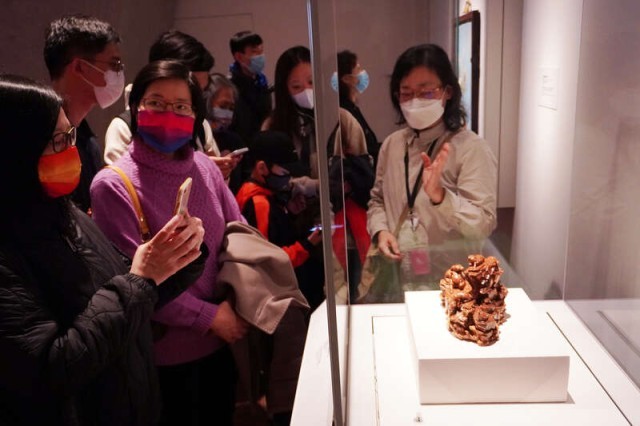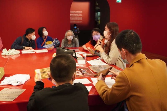 1月25日,香港故宫文化博物馆工作人员正在带领观众沉浸式体验“文物修复”。
