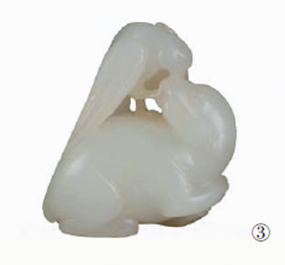 鹞子扑熊饰件(图③)就是一件清代巧匠所制苏玉的代表,它通宽4.3厘米,由和田白玉雕琢而成,玉质温润细腻。鹞子双目圆睁,长翅下扑,两爪踩熊之背和下颌,长喙啄咬熊之头,熊则回首作惊恐状,将鹞子扑熊瞬间的表情表现得淋漓尽致,展现出苏作工艺的细腻与精妙。鹞子,又称“雀鹰”,与熊一起有“英雄”之意,属传统工艺题材,这在清代十分流行。