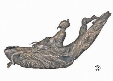 朱碧山造银槎杯(图②)为元代著名铸银工匠朱碧山制作,斜长22厘米,宽7.5厘米,高11.4厘米。槎,意为“水中浮木”,此器以仙人乘槎凌空飞越到达银河的神话故事为题材,将银酒杯巧制成树槎形的一叶扁舟,一老人靠槎尾而坐,仰首束发、长须髯髯,身着宽袖长袍,腰束飘带,双目注视远方,作乘舟凌波之状。树槎为枯枝杈,背部有细瘦阴刻铭文“至正乙酉朱碧山造”。整器设计精巧,造型奇特,融入了焊接、锤錾、镌镂等多种技巧,錾刻精细,颇具艺术感染力。