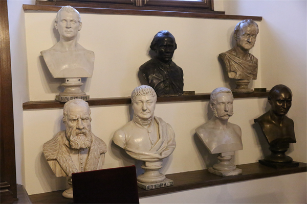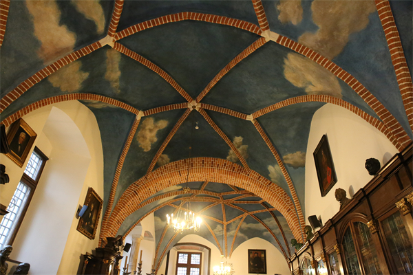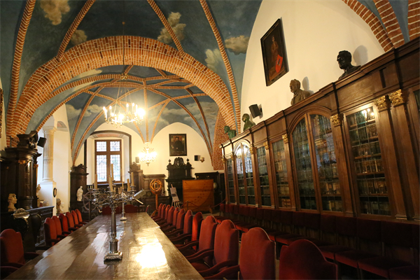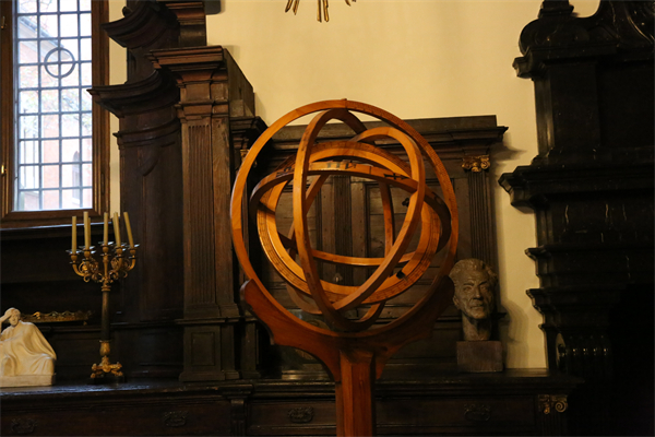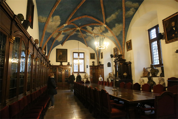 下午,我回到伟大的学院,迫不及待地走进图书馆大厅。我立刻被图书馆大厅晚期哥特式网状拱顶吸引,更被拱顶的蓝天白云吸引:无论白天,还是黑夜,人们可以永远在“蓝天白云”下看书。讲解员介绍,这里正是几个世纪以来存放书籍的地方,也是学者们钻研苦读的地方。拱形房间可以更好地防火,可以更好地保护图书。新巴洛克风格的书柜里陈列着Pusłowski家族的藏书。图书馆大厅中摆放着一系列半身像,它们代表了从古代到19世纪的文化人物。墙壁上挂着为学院图书馆的发展做出重要贡献的人物肖像。更不能错过的是,大厅一端陈列着20世纪仿造的哥白尼曾经使用过的木制天文仪器,包括象限仪、三角仪和浑天仪。并且,直到今天,这座图书馆也还是雅盖隆大学参议院每月开会的地方。