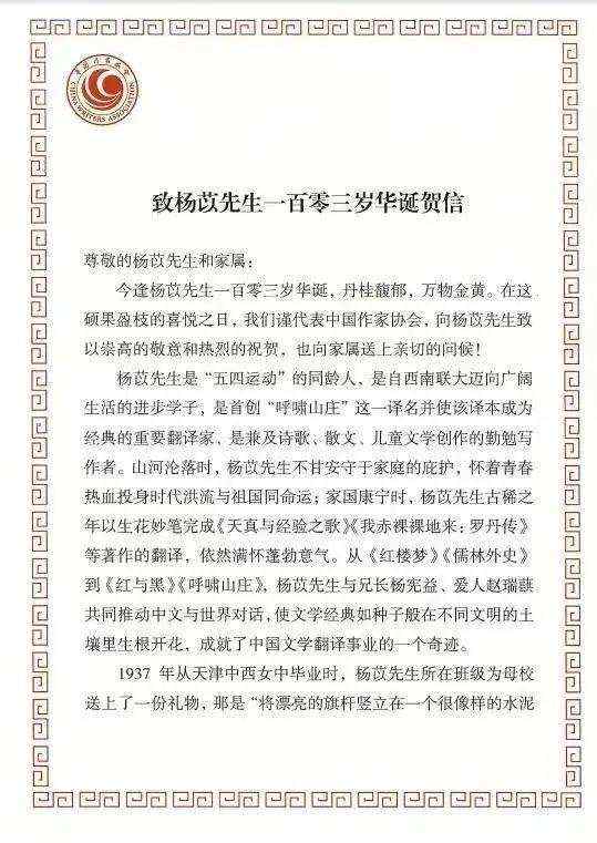 103岁生日之际,中国作协主席、中国文联主席铁凝,中国作协党组书记、副主席张宏森致信祝贺: